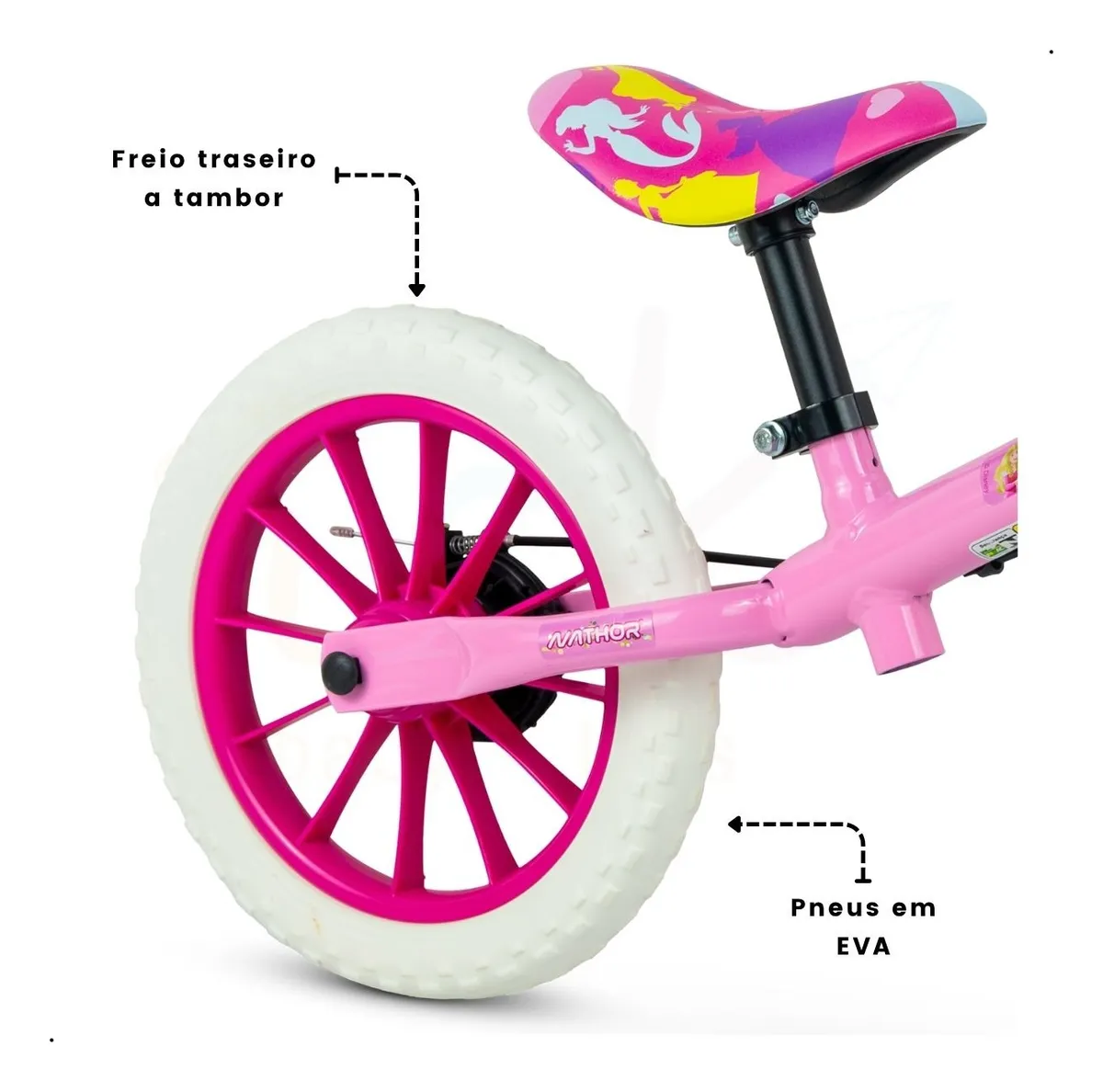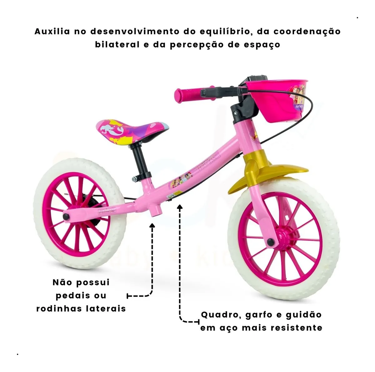 BICICLETA BALANCE BIKE ARO 12 – NATHOR A entrada perfeita para o mundo das bikes! A Balance bike é indicada para crianças a partir de 2 anos ou com altura entre 85cm e 100cm. A Balance não possui pedais ou rodinhas laterais, por isso é uma importante aliada na evolução da criança – já que foi pensada para auxiliar no desenvolvimento do equilíbrio, da coordenação bilateral e da percepção de espaço. Crianças que brincam com a Balance desenvolvem equilíbrio estático e dinâmico, e têm muita facilidade para, posteriormente, pedalar uma bike comum, e sem o auxílio de rodinhas laterais. A Balance também age na construção da autoestima e da confiança, pois dá autonomia para a criança. A bicicleta Balance Nathor conta com limitador de giro do guidão (garantindo mais segurança), pneus em E.V.A. (mais leves e antiderrapantes), freio traseiro a tambor e regulagem de altura do selim de PU. Diversão, liberdade e desenvolvimento em uma saudável brincadeira! * CARACTERÍSTICAS: *- Quadro, garfo e guidão em aço carbono; *- Limitador de giro do guidão; *- Pneus em E.V.A.; *- Cestinha ou plaquinha; – Mesa de direção em nylon reforçado; *- Selim em PU com regulagem de altura; – Abraçadeira do selim em alumínio; *- Freio traseiro a tambor; – Trava de segurança. * Informações: – Contém: 1 bicicleta balance – Indicado: a partir dos 2 anos – Tamanho da roda: 12″ – Altura máxima recomendada: 85cm a 100cm – Peso máximo recomendado: 21kg – Peso aproximado (produto): 2,780kg – Dimensões aproximadas: 86 x 55 x 43cm – Composição: Quadro, garfo e guidão em aço carbono; Selim em PU – Garantia: 90 dias – Produto novo – Original INMETRO 4983/2019 Imagens meramente ilustrativas. As cores podem variar entre as imagens mostradas acima e o produto. NATHOR A Nathor é a maior indústria de bicicletas infantis da América Latina, com mais de 37 anos de história. Em nosso parque fabril com mais de 24 mil m², temos a capacidade de produzir até 7 mil bicicletas diariamente. Graças aos nossos diferenciais nos tornamos referência em bicicletas infantis, nossos produtos possuem detalhes funcionais que fazem a diferença no conforto e segurança, tudo isso alinhado à nossa cultura de testes e desenvolvimento diretamente com o cliente.